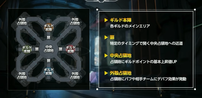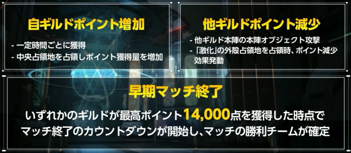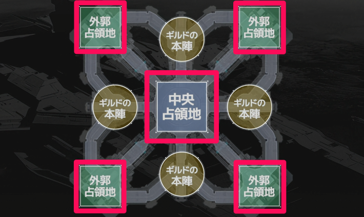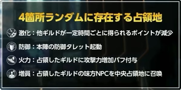 | 敵ギルドのポイントを減らす | 敵本陣を攻撃する 外郭占領地(激化)を獲得する |