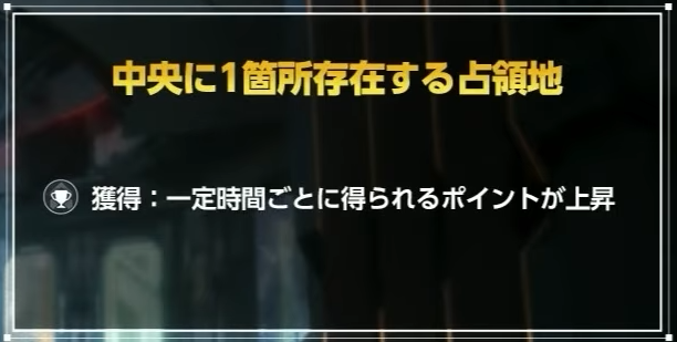 マップには中央占領地と外郭占領地が存在し、それぞれランダムに位置が変動します。また、中央占領地ではポイントが追加で獲得でき、外郭占領地では占領地ごとに異なるバフが得られます。