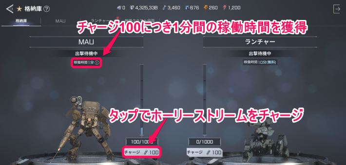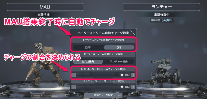 MAUとランチャーは本来ホーリーストリームという燃料のチャージが必要ですが、毎日無料で10分間は稼働させることができます。既にチャージ済みの場合でも1回目の出撃では、ホーリーストリームが消費されません。
