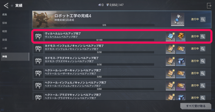 | ▼実績 | 【おすすめ度】★★☆☆☆ ・入手方法が多い ・MAUやランチャーの強化を優先するならおすすめ |
