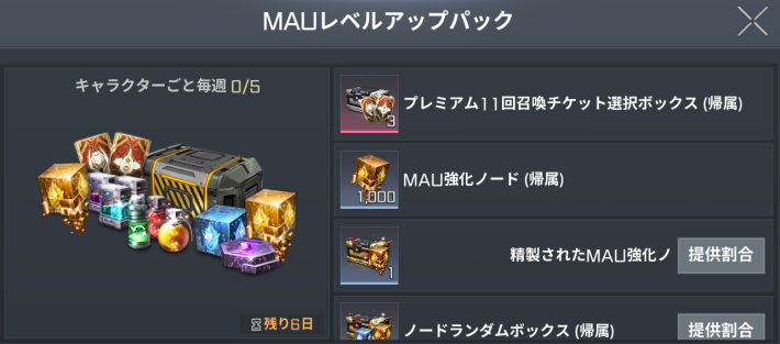 課金パックには、MAUやランチャーのレベルアップに特化したものが販売されていることがあります。内容によっては大量に獲得可能となっているので、販売中の課金パックは定期的にチェックするのがおすすめです。