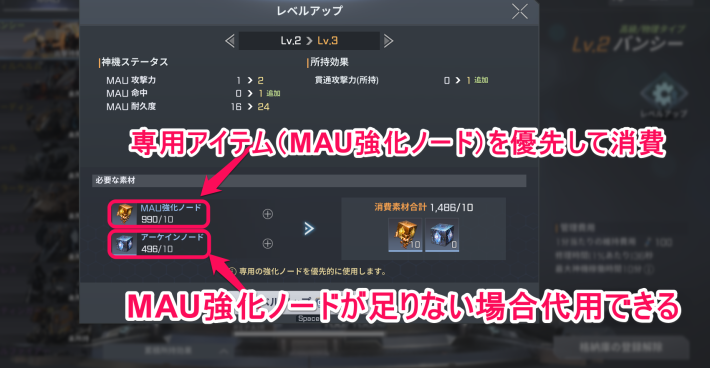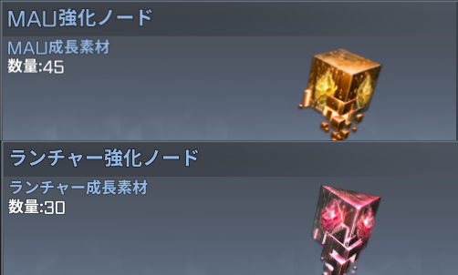 MAUやランチャーは、格納庫からCRと専用アイテムの「強化ノード」を消費してレベルアップが可能です。それぞれの強化ノードは、アーケインノードで代用することもできます。