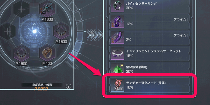 物質変換はLv.50から解放される機能で、希少グレード以上の帰属ではない装備を素材として別の装備やアイテムに変換します。確率でMAUやランチャーの強化ノードが出現することがあります。