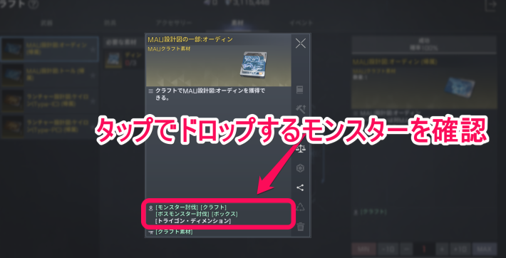 「特殊」に分類されるMAUやランチャーは、モンスターやボスからドロップする設計図を用いてクラフトすることができます。設計図の詳細からドロップするモンスターを確認可能です。