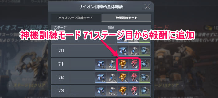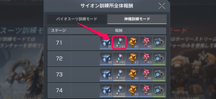 MAUやランチャーの強化ノードは、基本的にダンジョンのサイオン訓練所で集めましょう。強化ノードは神機訓練モードのステージ71から報酬に追加されるため、毎日進めましょう。