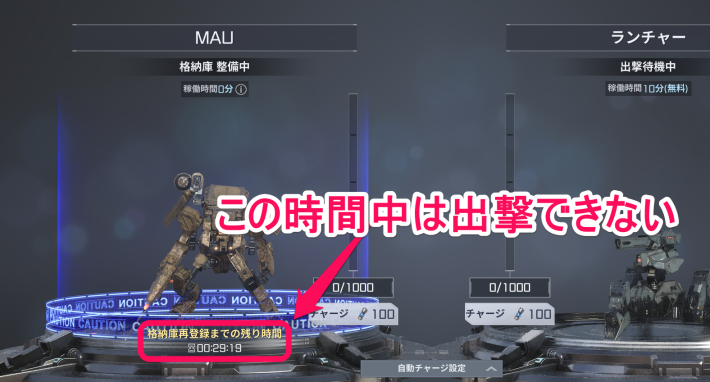 MAUやランチャーは格納庫に回収されると、自動的に修理を開始します。修理に必要な時間は格納庫から確認でき、この時間中は再度の出撃ができません。