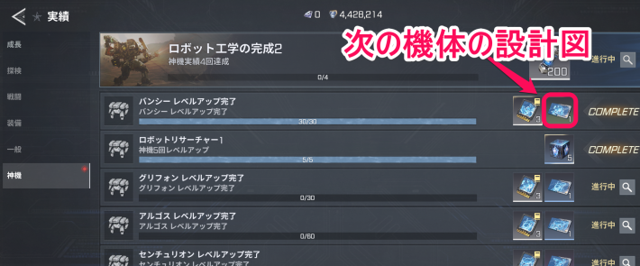 MAUとランチャーは初期期待から順に強化を行い、最大レベルに到達すると次の機体の設計図が手に入ります。
