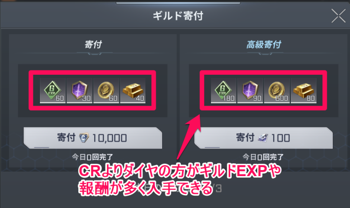 また、ギルドレベルを上げるとギルドショップのラインナップ追加などのギルドメンバー全員への恩恵があるため、ダイヤの寄付などでギルドレベルを更に効率よく上げるという選択肢もあります。