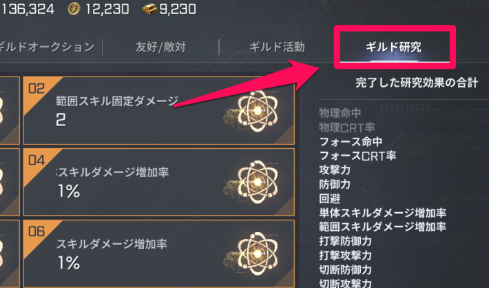 ギルドメンバーにかけられるバフは、ギルド研究とギルドスキルの二種類があります。どちらも解放・完了まで時間を要するため、参加前にバフのレベル上げや解放を済ませておきましょう。