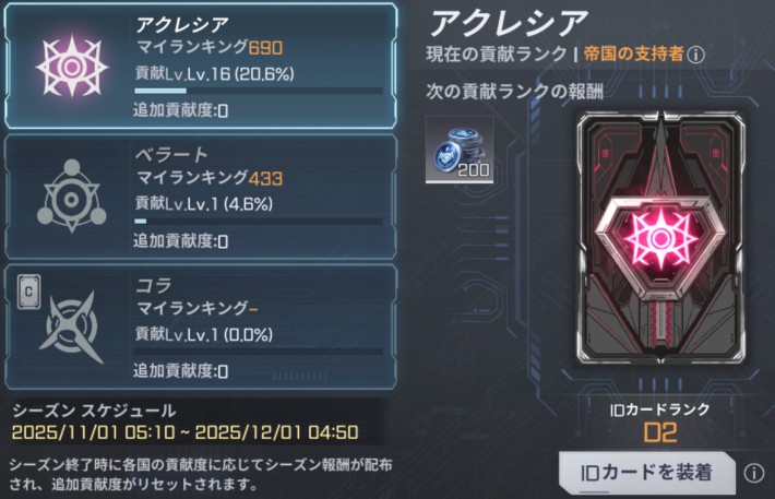 所属する国家の変え方は、装備するIDカードを変更するだけでOKです。貢献度ランクが目標に到達したり、ウォーゾーンに参加する際に切り替えて使いましょう。