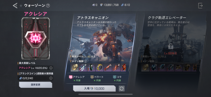 各国家の中で一番貢献度レベルが高い国家に合わせて、ウォーゾーンで週に獲得できるブランクコインの上限が決まります。そのため、1つの国家の貢献度レベルを集中的に上げるのがおすすめです。