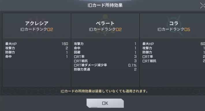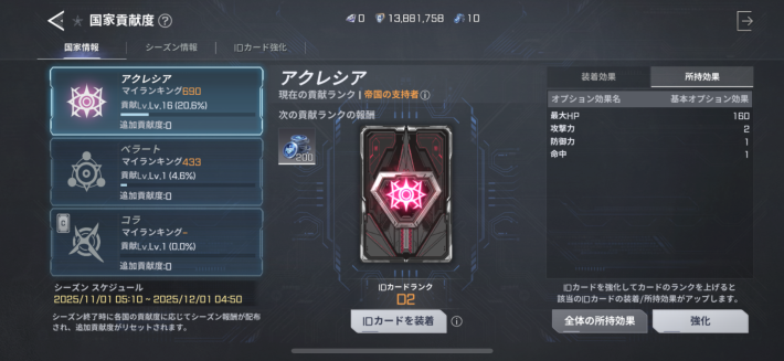 国家貢献度は装備中のカードに対応した国家の貢献度が上昇するため、各国家の貢献度レベルを上げる場合は、必ず対応した国家のカードを装備する必要があります。