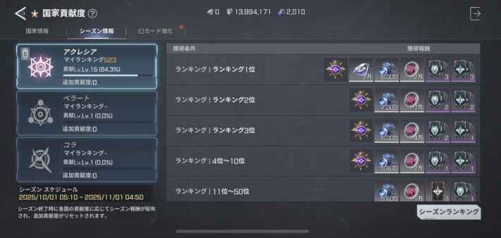 ランキングの上位になってくるとなかなか1段階上の報酬を獲得するのは難しいです。その場合は他の国家のランクを上げてより多くの報酬を獲得するのがおすすめです。