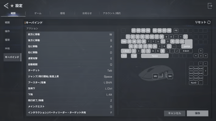 PC版のキー設定はホーム画面右上の三本線からメニュータブを開き、右下にある歯車マークから設定メニューを開くことで行えます。「戦闘」タブ内で「キーバインド」を選択すると、キー割り当てを自由に変更できる画面が表示されます。