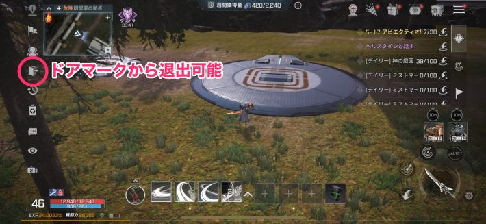 ウォーゾーンからでたい場合は画面左側にあるドアのマークから退出可能です。再入場する際には再び入場費用がかかる点には注意しましょう。