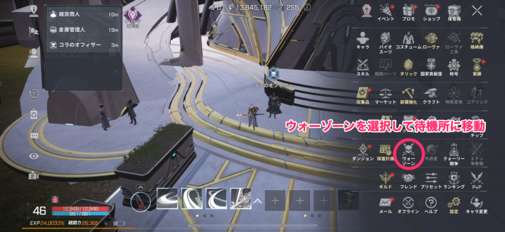 メニュー画面から「ウォーゾーン」を選択して、国家ごとの待機所に移動しましょう。その後、各国家のオフィサーに話しかけることでウォーゾーンに参加できます。