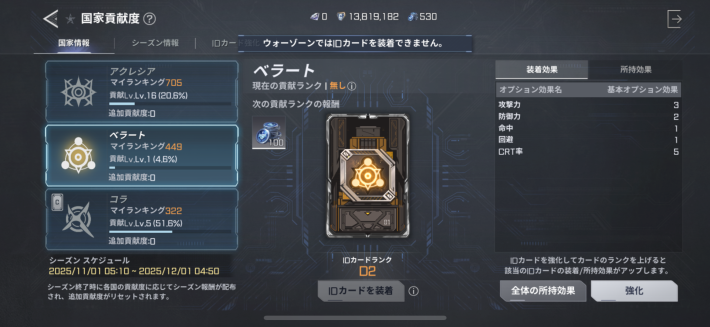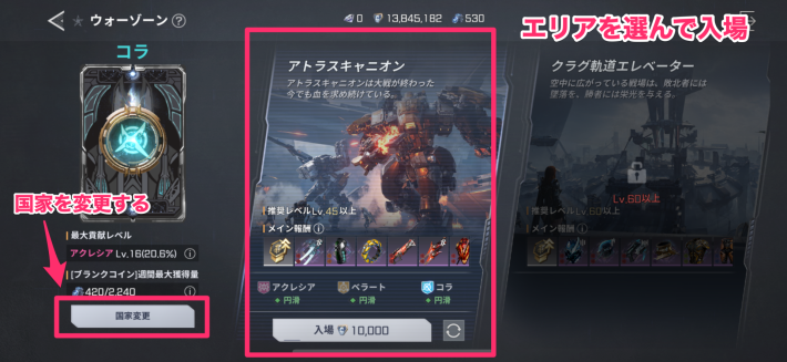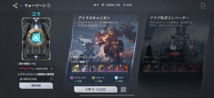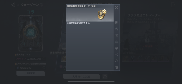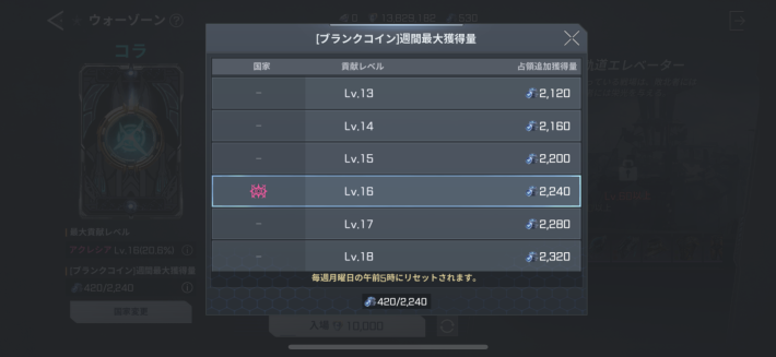 各国家の中で一番貢献度レベルが高い国家に合わせて、ウォーゾーンで週に獲得できるブランクコインの上限が決まります。そのため、1つの国家の貢献度レベルを集中的に上げるのがおすすめです。