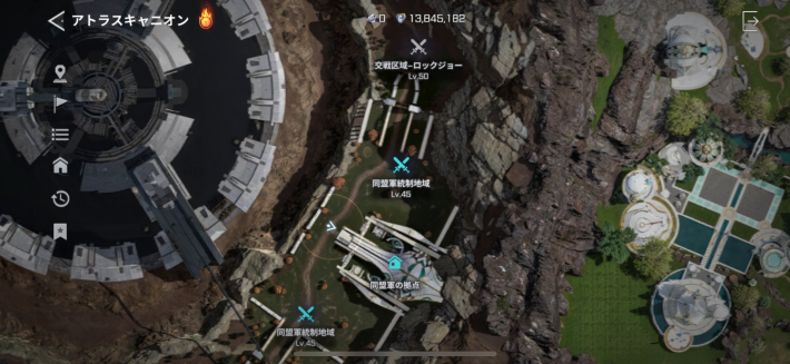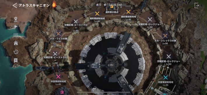 入場時は国家ごとの拠点に転送され、一番レベルの低い狩場は他国家の拠点からも遠く、他の国家のプレイヤーと遭遇しづらいです。ただ、レベルの高い狩場は各国家の拠点の中間地点にあるため、他の国家のプレイヤーからの攻撃に注意が必要になります。