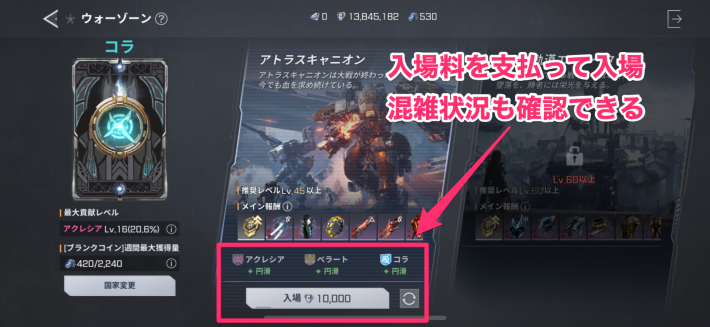 参加するエリアとフィールドを選択したら、入場費を払うことで参加できます。参加するエリアには入場人数に制限があり、各国家ごとに150人まで入場可能です。
