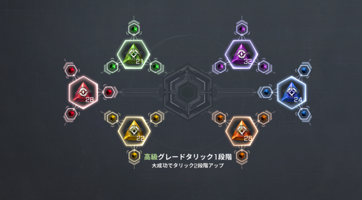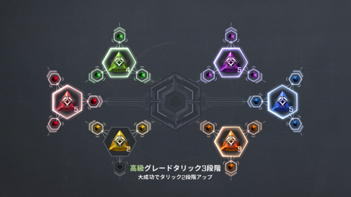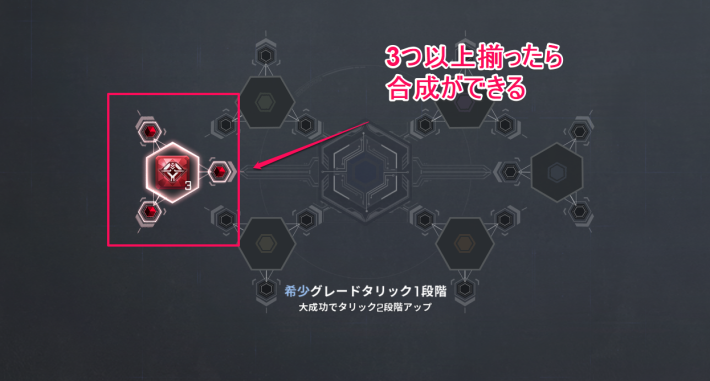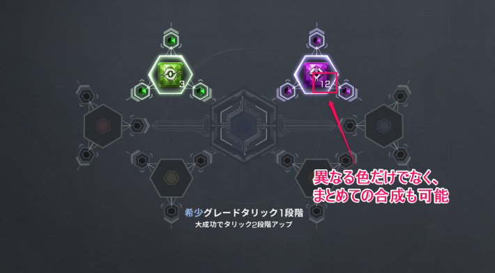色と段階が同じタリックを3つ集めることで合成可能です。合成に成功するとタリックの段階を1つあげることができ、3段階に達している場合には、グレード(レア度)が1つ上がります。