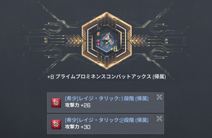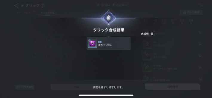タリックは装備に追加ステータスを付与しキャラを強化する仕組みです。一般グレード、高級グレード、希少グレード、英雄グレード、伝説グレードがあり、合成することで段階(1~3段階が存在)やグレードを上げることができます。