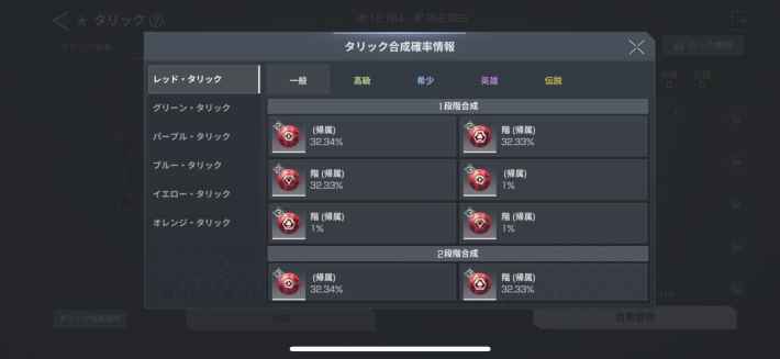 タリックが合成に成功する確率はグレードで違いがありません。成功時の1段階上昇は約32%、大成功時の2段階上昇は各1%となっています。合成確立は、合成画面左下の「タリック合成確立」から確認ができます。