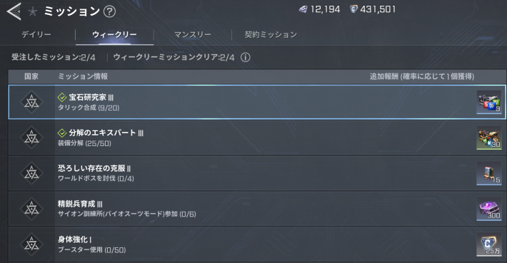 メニュー画面内にある「ミッション」のウィークリーでは、タリックを合成するミッションが含まれており、タリックを獲得することができます。まれにメインクエストの報酬にも設定されています。