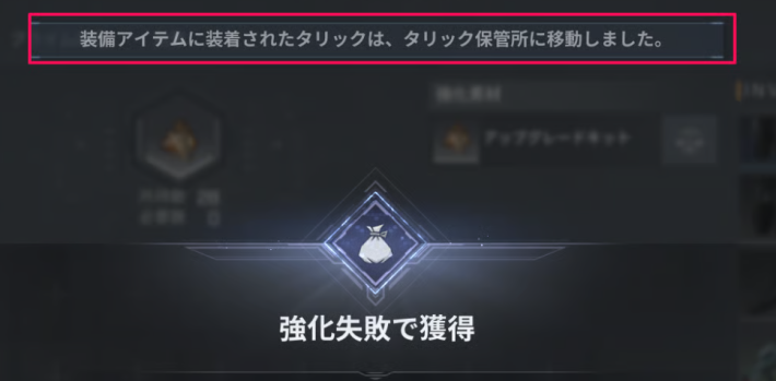 タリックを装着している装備が破壊されても、タリックは無くなりません。装備強化はタリックを外さず、挑戦することが可能です。
