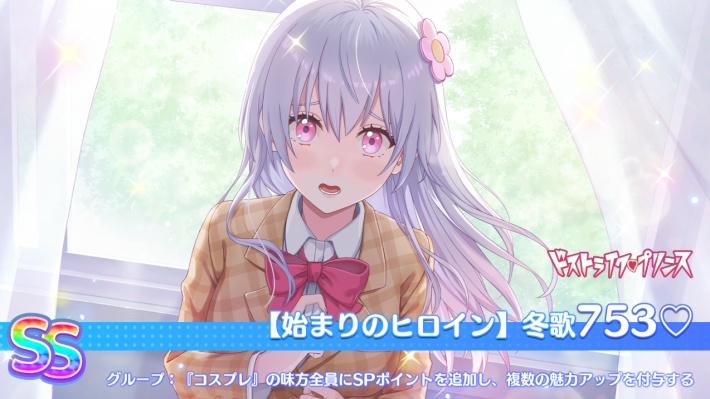 イベント実装に合わせて限定私服753♡も実装されました。自身にファンサービスバフをかけて火力を高めるアタッカー。味方がCHEERスキルを使用すると永続で魅力アップもされるため、美花莉やノノアと合わせる事で与えるポイントがアップしていきます。