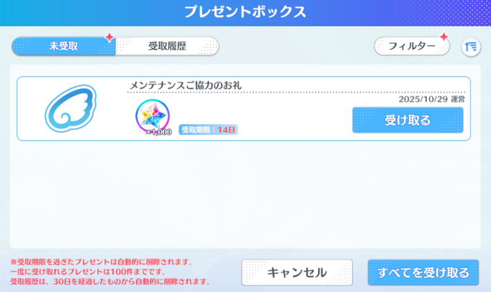 9/17(火)の不具合修正のお詫びして、配布が告知されていたスタージュエルが配布されました。受け取りは10/7(月)までで、メンテナンス時点でコンテストを解放していた方が対象になります。