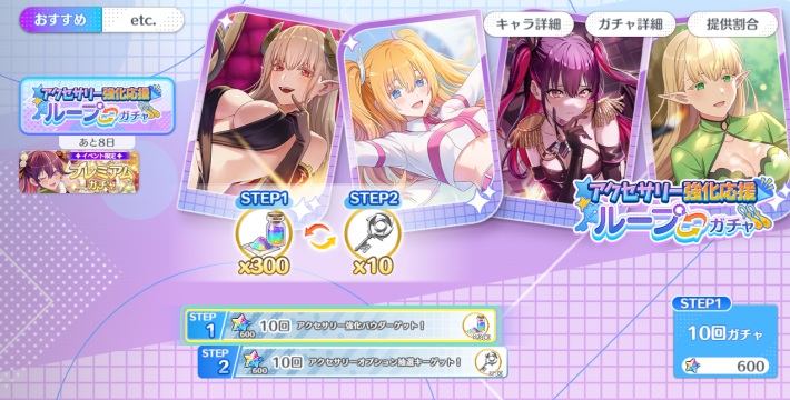 11/21(金)の18時より、アクセサリー強化応援キャンペーンが開催。ループガチャでは限定キャラの入手はできないものの、ガチャを引くごとに専用化アクセサリーの強化素材を獲得できるため、少ないスタージュエルで効率良く育成素材を集める事ができます。