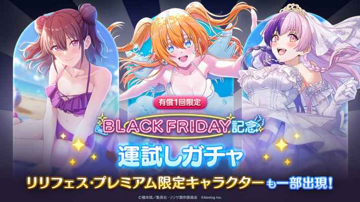 ブラックフライデー運試しガチャが開催。過去登場したほとんどの限定キャラが入手可能で、有償スタージュエル50個で10連を1回だけ引くことができます。水着天使空挺隊はすべて復刻されているので、課金しているなら最優先で引いておきたいおすすめガチャになります。