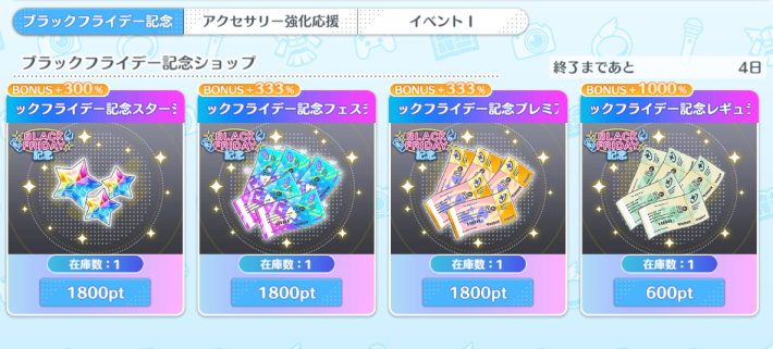 ブラックフライデーを記念した限定パックが販売。ガチャ10連分のスタージュエルや各種ガチャチケットが手に入ります。スタージュエルやリリフェスガチャチケットは貴重なので、課金する場合は最優先でおすすめのパックになります。