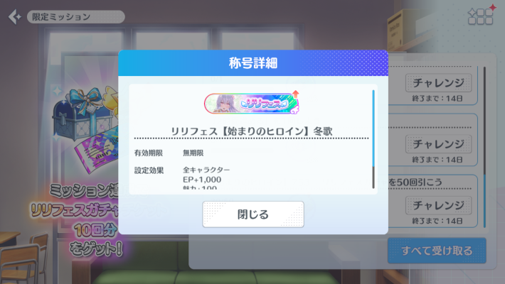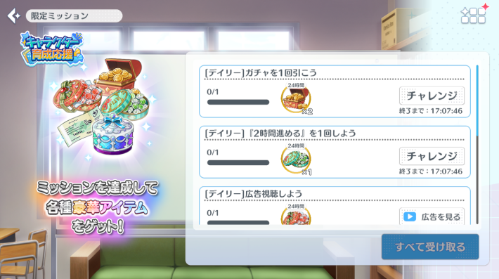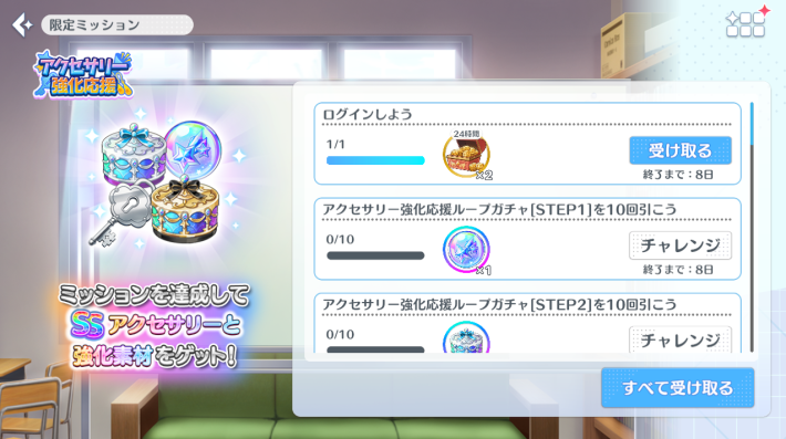 橘美花莉の実装に合わせてガチャミッションも追加。最大90回のガチャを回す事で、すべての報酬を獲得する事ができます。