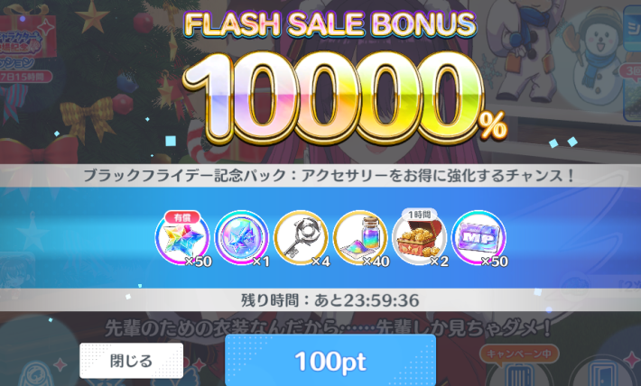 ブラックフライデー記念パックのフラッシュセールで100円で販売されているパックで、アクセサリーの強化素材と一緒に獲得できます。超お買い得パックなのでガチャを引くためのスタージュエル入手はもちろん、育成目当てでも最優先で購入を検討しましょう。
