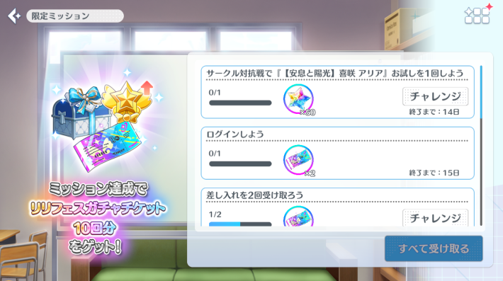天乃リリサの実装に合わせてガチャミッションも追加。最大90回のガチャを回す事で、すべての報酬を獲得する事ができます。