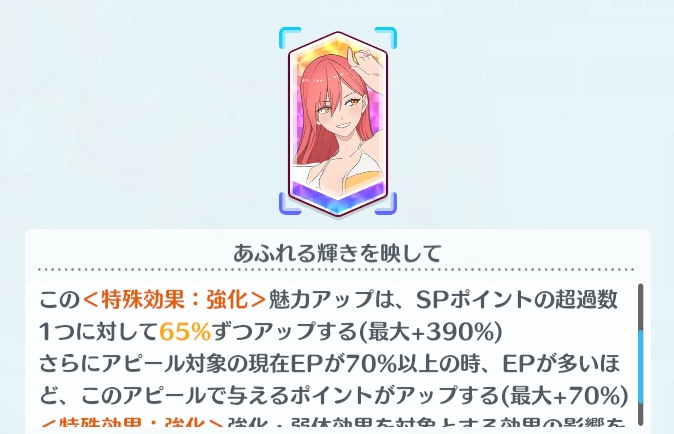 アリアはパッシブスキルの効果でSPポイントを貯めてSPスキルを使う事で、自身の魅力を大きく底上げする事ができます。最大で+6まで貯められるので、なるべく貯めてからSPスキルを発動するのがおすすめです。