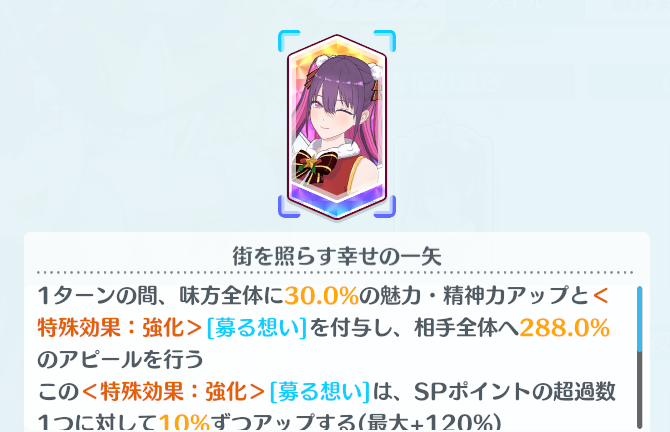 橘美花莉(クリスマス)はパッシブスキルの効果でSPポイントを貯めてSPスキルを使う事で、味方全体への魅力・精神力バフに加えて、付与する募る想いの効果倍率を底上げする事ができます。最大で+12まで貯められるので、なるべく貯めてSPスキルを発動しましょう。