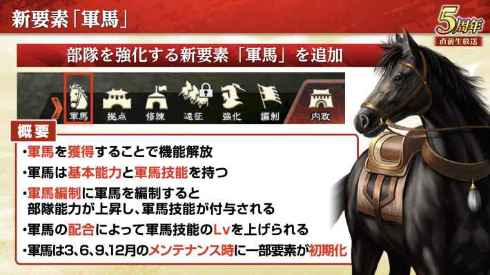 アプデ後からは新要素「軍馬」が追加される。軍馬は攻撃や防御などの基本ステータスに加えて特別な技能「軍馬技能」を所持しており、編制することで通常の編制と自都市駐屯部隊を強化できる。