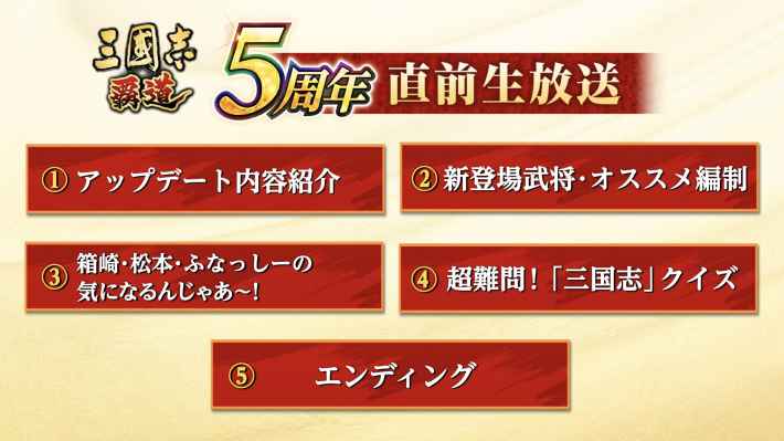 三國志 覇道の生放送で告知された情報を紹介。最新のアップデート・イベント情報も紹介しているので、三國志 覇道(三国志覇道)について調べる際の参考にして下さい。