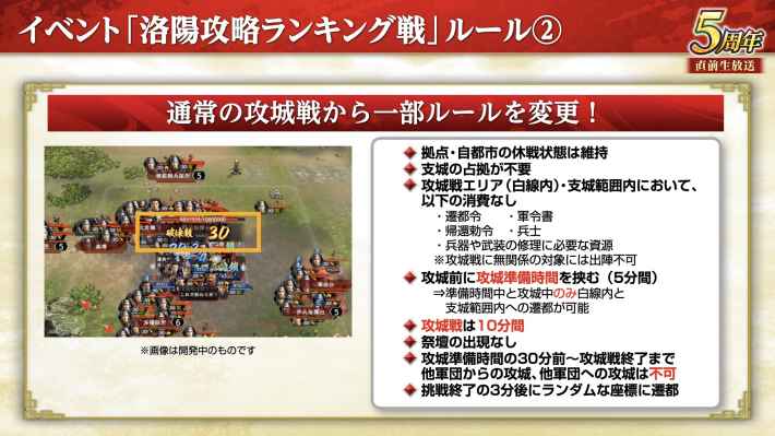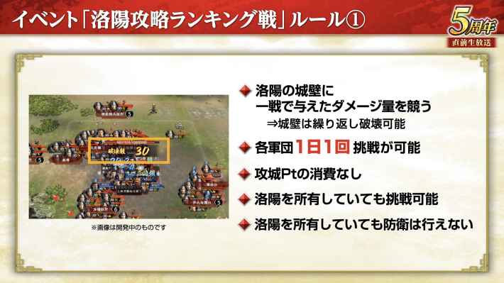 10月13日からイベント「洛陽攻略ランキング戦」が開催される。黄巾大討伐や異民族襲来のように軍団単位で参加するイベントであり、Bランク以上の主要都市でNPC以外に1回でも勝利した軍団が参加できる。