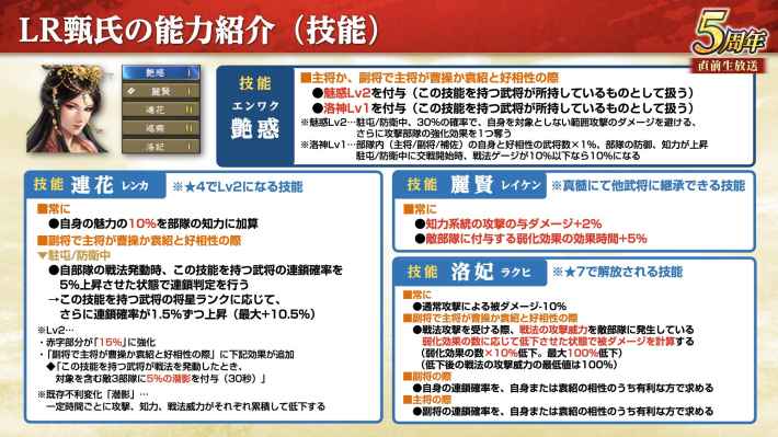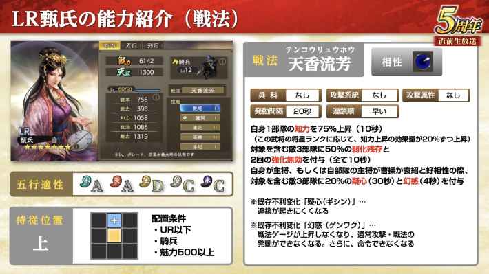 技能「慧断」の効果で、戦法発動時に自身1部隊の撃心発生を25%上昇させる。自身の戦法連鎖順は「早い」なので、LR袁紹の副将で連鎖した際はLR袁紹の戦法ダメージを撃心でさらに伸ばせる。