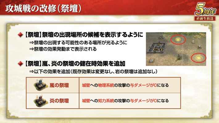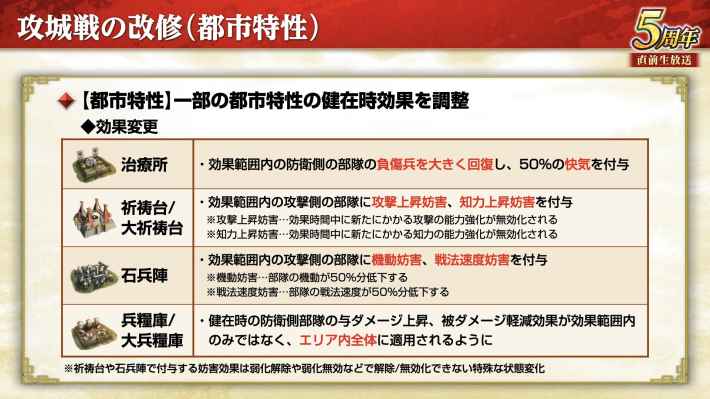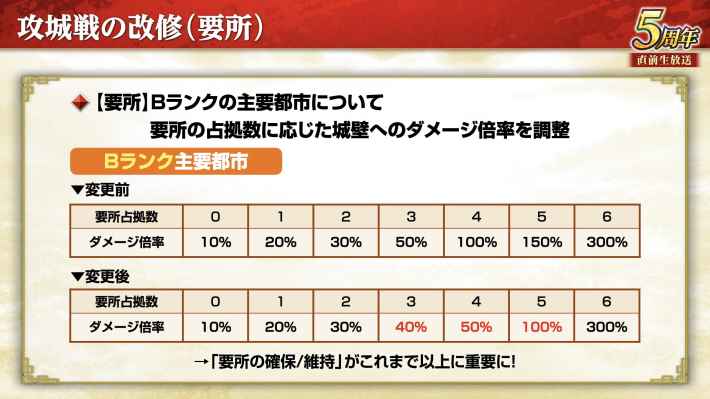 Bランク主要都市における城壁のダメージ倍率が調整される。要所6つ占拠中の倍率は変わらないが、3~5つ占拠中の倍率が低くなるため、これまで以上に要所の占拠と維持が重要となる。