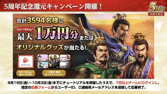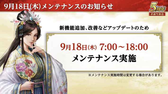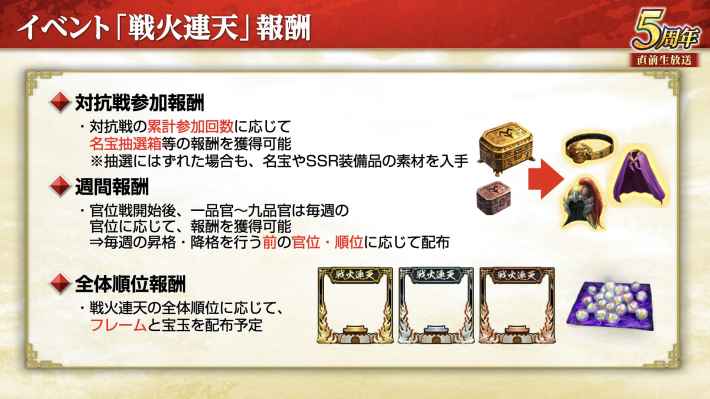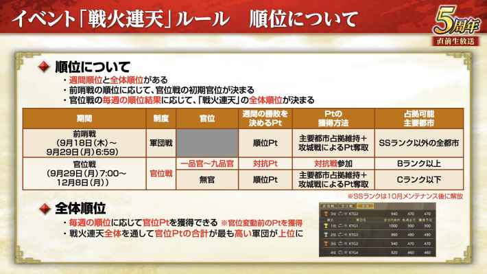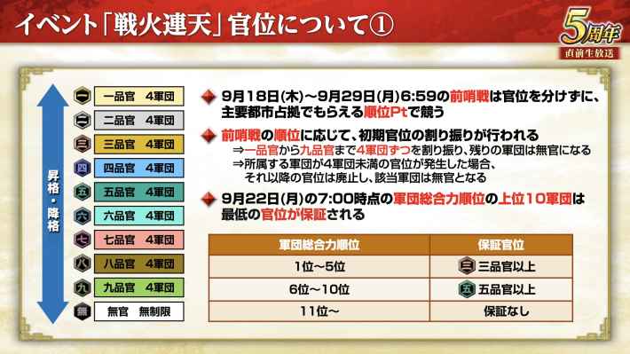 9月18日のメンテナンス明けから新長期イベント「戦火連天」が始まる。戦火連天は9月26日までの前哨戦で所属官位が決まり、その後の官位戦で得た官位Ptの多い軍団が最終的な勝者となる。