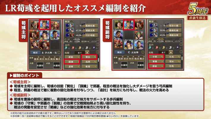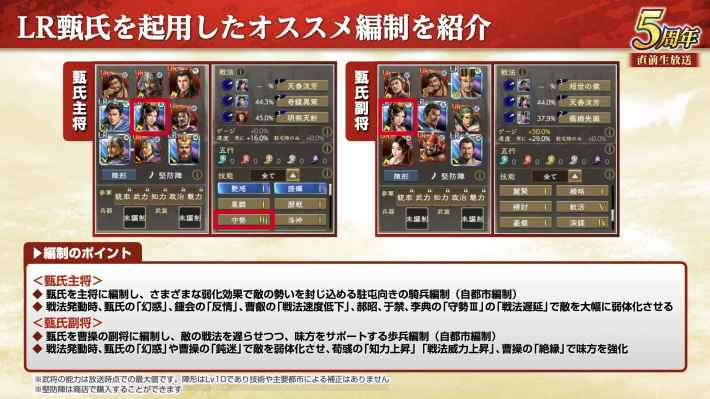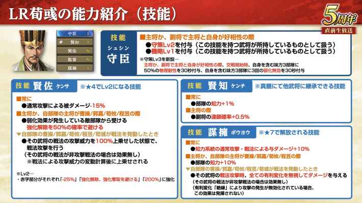 技能「賢佐」と「謀擁」の主な効果は、主将が曹操/郭嘉/荀攸/程昱であれば補佐でも発動する。賢佐で敵からの強化解除を避けるので、LR曹操と組み合わせれば