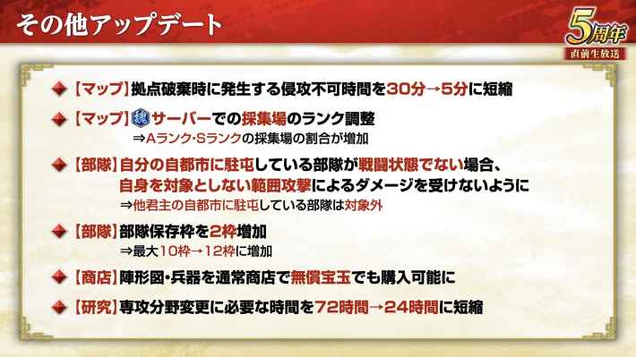 アプデ後から、自都市に駐屯している部隊は非戦闘時に範囲ダメージを受けなくなる。さらに兵器陣が無課金でも使えるようになるなど、その他アップデートも複数行われる。