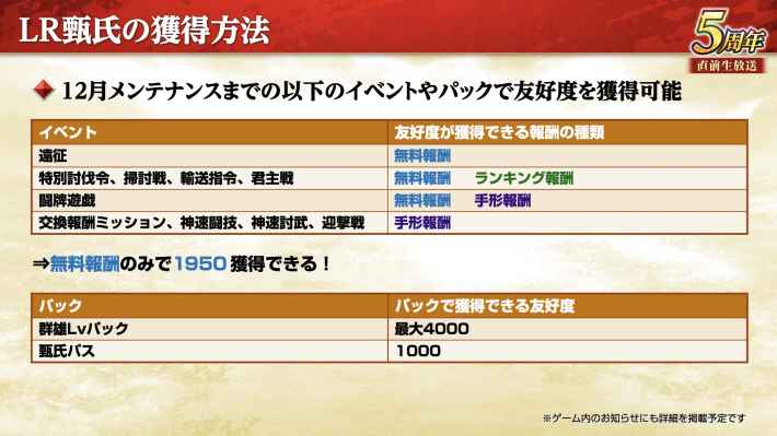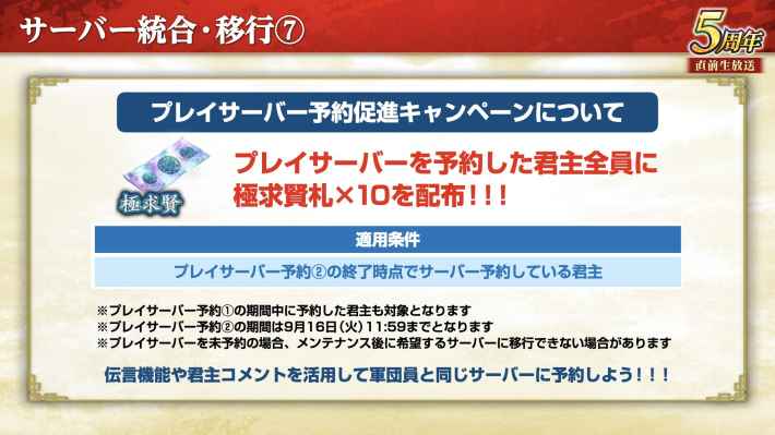 期間中にプレイサーバーを予約すると極求賢札が10枚貰える。特に無課金で入手できる機会は非常に少ないので、同じサーバーでプレイを継続する場合でも予約はしておこう。