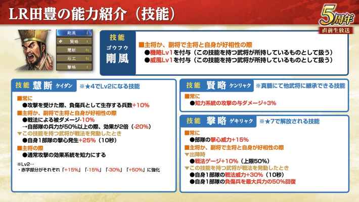 LR田豊は戦法でランダムなバフを付与する歩兵武将。主にLR袁紹と組み合わせて使う他、侍従位置が歩兵武将で唯一の「左下」なので、好相性武将を必要としない部隊であれば侍従目的で補佐として使える。