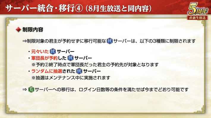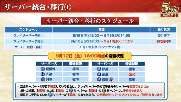 予約しなかった場合、プレイ可能な魏サーバーは「元から所属していたサーバー」と「軍団長が予約したサーバー」と「ランダムに抽選されたサーバー」の3つに制限される。