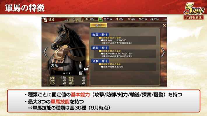 軍馬は種類ごとに決められたステータスを持ち、軍馬技能は最大3つまで所持できる。軍馬技能は全部で30種類存在する。